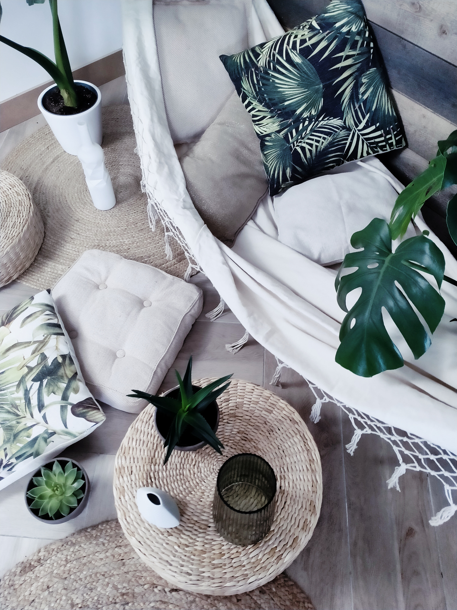 Mise en scène d'objets de décoration. Ambiance chill tropical avec ce mélange de textures, de matières, et de motifs.